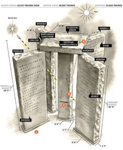 Un mensaje corto esta inscrito en la cima de la estructura en 4 antiguos códigos de lenguajes, babilónico, Griego clásico, sánscrito, y jeroglíficos egipcios.Es muy importante mencionar que estos últimos lenguajes antiguos son de una gran importancia en las enseñanzas de escuelas de misterios ocultos, como los masones y los rosa cruces.