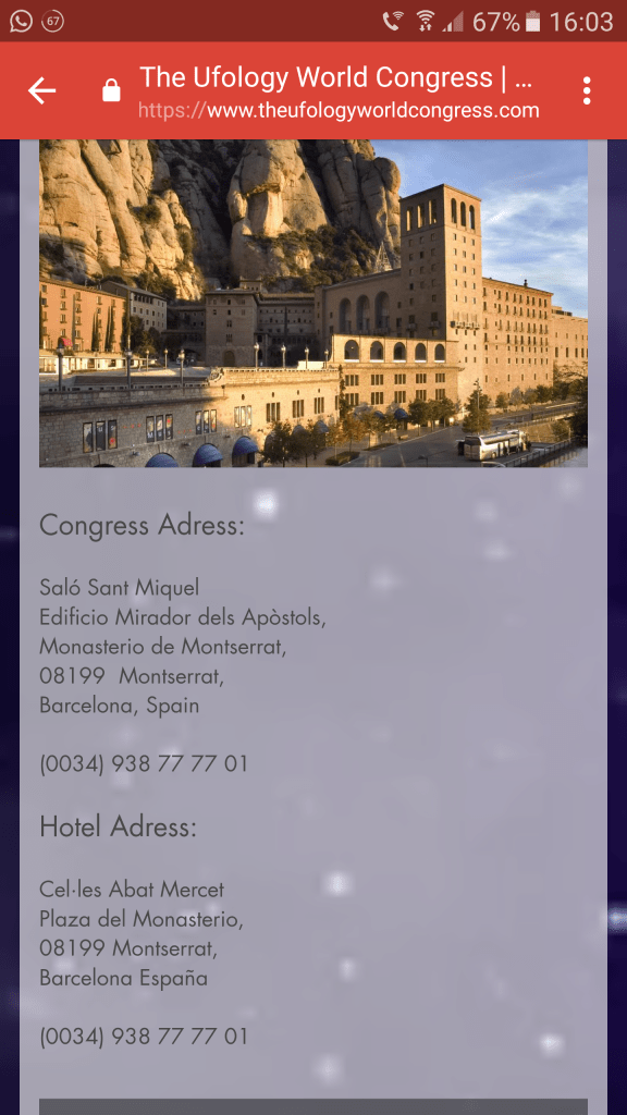 Hola amigos lectores y del misterio, pronto será un gran congreso en Barcelona “ubicado en la montaña Montserrat”. Los días son del 19 de septiembre al 21 del 2017, lo comento pro aquí por si quieren venir y ya de paso nos conoceríamos. Es un congreso a nivel mundial donde vendrán muchas personalidades de investigación UFO y en donde no podemos dejar pasar “conocer” y saber más de la materia.