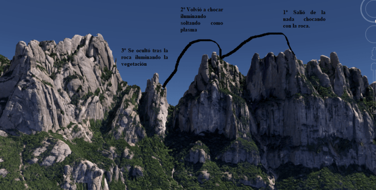 Pues bien, estando mirando en ese momento la montaña (Paco y yo) escuchando a Nico hablar, salió de la nada una luz verde con gran cabeza y una pequeña cola (donde fue revotando en varios picos, para terminar escondida de tras de una) ¡Impresionante! Aun así, no solo fue eso, es que incluso al pasar pudimos ver como ilumino la vegetación de dicha montaña, claro que, pensé que podría ser un puntero láser, pero pensando en ello (no vimos el cono de luz del láser), es decir, si alguien de la explanada enfoca con el puntero láser a la zona, podría verse la trayectoria desde dicha explanada a los picos de la montaña (lo digo más que nada, porque yo mismo poseo uno y practique para sacar conclusiones), así pues, no fue un puntero láser.
