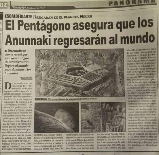 Hace poco vi en las redes sociales de alguien que subió un archivo o, mejor dicho, una fotografía donde anuncia el pentágono, la llegada de los Anunnaki. No sé si eso será cierto o posiblemente estén desde siempre entre nosotros. La cuestión que me pareció interesante este recorte para todos vosotros. Aun así, si eso mismo ocurriera sería interesante. Dejo la imagen de un periódico para que puedan verla y como no, esperando poder encontrar el artículo real para poder seguir leyéndolo. Podría ser una manipulación, podría ser que todo fuera una mentira, pero recordar que podría ser posible que desde siempre estuvieran entre nosotros.