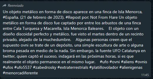 Hoy publicaron en el periódico de Menorca un objeto esférico plateado en una zona protegida, fue ayer día 21 de febrero del 2023 cuando se pudo ver y sí, es de un escultor o una escultura donde a muchas personas les aterraron por ver o parecer un ovni. Bueno, menos mal que salen cositas o fuentes donde dicen otras cosas de gente que inventa diciendo que son ovnis.
