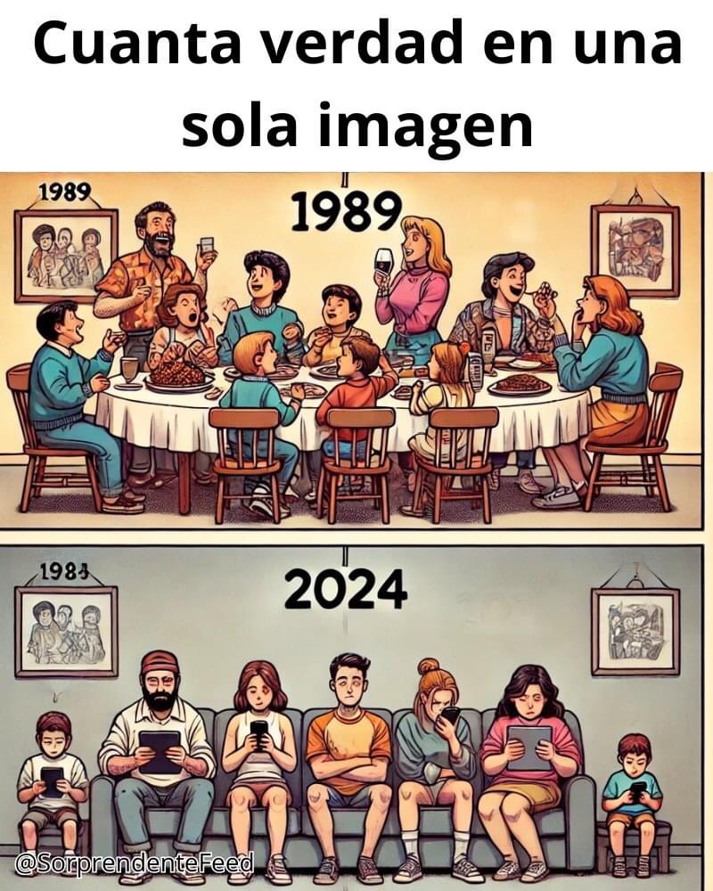 Hoy, como tantas veces he comentado, es la sociedad. Cada vez estamos tan avanzados que, nos olvidamos de lo primordial. El contacto con la gente —pero no soportamos a la gente—. Si miráis la imagen, podréis ver la realidad de todo lo que está ocurriendo. En esos años de los 70, 80 y los 90 fueron las mejores décadas con poquísima tecnología. Sin ello, fuimos más felices y será algo, que no volverá a ocurrir. Si ya estamos como estamos, en pocos años estaremos aún peor. Ya con lo que tenemos hoy en día, será algo que, lo tendremos que ver. Creo que hoy en día con todo lo que tenemos no nos hace felices, por eso, será aún peor a lo que hoy en día conocemos.