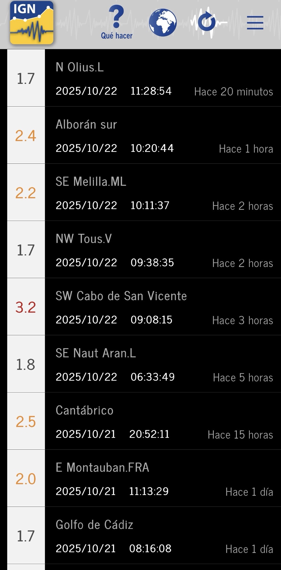 Precisamente, lo tengo puesto para toda España, pero también puedes hacer más grande la zona de terremotos para que te avise. Os dejo una sesión de imágenes donde podréis ver los terremotos a tiempo real y los ocurridos. Vale la pena tener en el móvil para estar en todo momento al tanto de lo que ocurre.