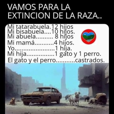 Cada año que pasa, menos posibilidades tenemos Algo que está causando furor en las redes y veo la participación de las masas referente a la imagen del comienzo de este artículo. Sí, la verdad que es preocupante o no, pues no todos pensamos de traer hijos al mundo para hacerlos sufrir y más sin un … More Vamos para la extinción de la raza, ¿es posible?